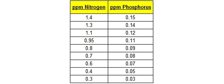 Tỉ lệ N:P = 20 – 30:1 cũng đúng khi gây tảo trong ao. Tỉ lệ N:P theo trọng lượng được tính theo bảng: