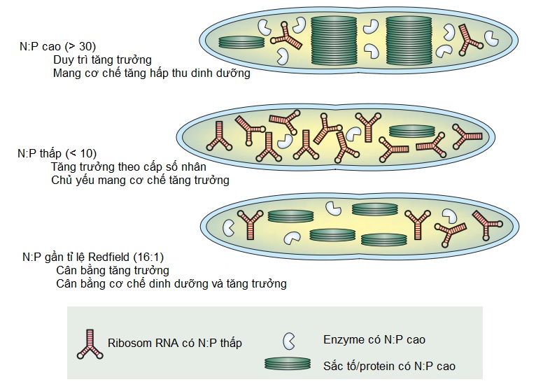 Cơ chế phát triển của tế bào tảo theo hàm lượng dinh dượng trong nước. Nguồn ảnh: Arrigo, 2005