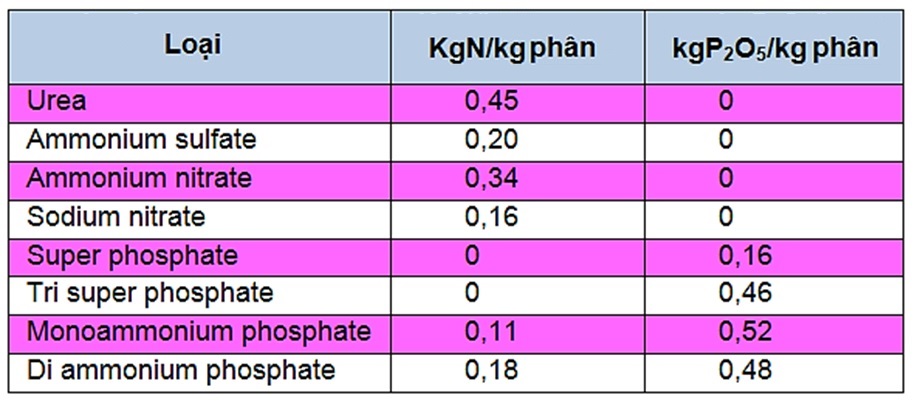 Một số loại phân và hàm lượng dinh dưỡng: