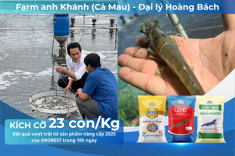 Tại Cà Mau, đại lý Hoàng Bách của anh Khánh (Cà Mau), tôm đạt size trung bình 23 con/kg, khỏe mạnh, vỏ bóng đẹp, ăn mạnh và phát triển đồng đều chỉ sau 105 ngày nuôi. Toàn bộ quy trình được áp dụng theo “Giải pháp Dinh dưỡng 360” của Grobest, sử dụng kết hợp Gold Shield, Lead và Hải Mã giúp tối ưu dinh dưỡng, cải thiện sức khỏe đường ruột và tăng khả năng bắt mồi cho tôm.