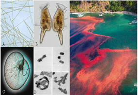 (Một số giống loài tảo độc hại – A: Pseudoniszchia pungens, B: Dinophysis caudata, C: Noctiluca Scintillans, D:Microcystis aeruginosa, E:Noctiluca scintillans nở hoa ở Newzealand)